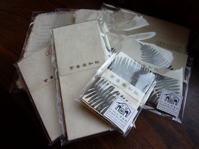 ワークセンター紫香楽さんから和紙のレターセットやポチ袋が届きました。こちらの和紙は手漉きで作られているもので、その工程はとても手間のかかるものです。作ったものの半分ぐらいしか商品にならないというこの貴重な和紙、風合いがとてもよく写真でお伝えできないのが残念です。植物が印刷されているものは本当の植物を写して作られているそうです