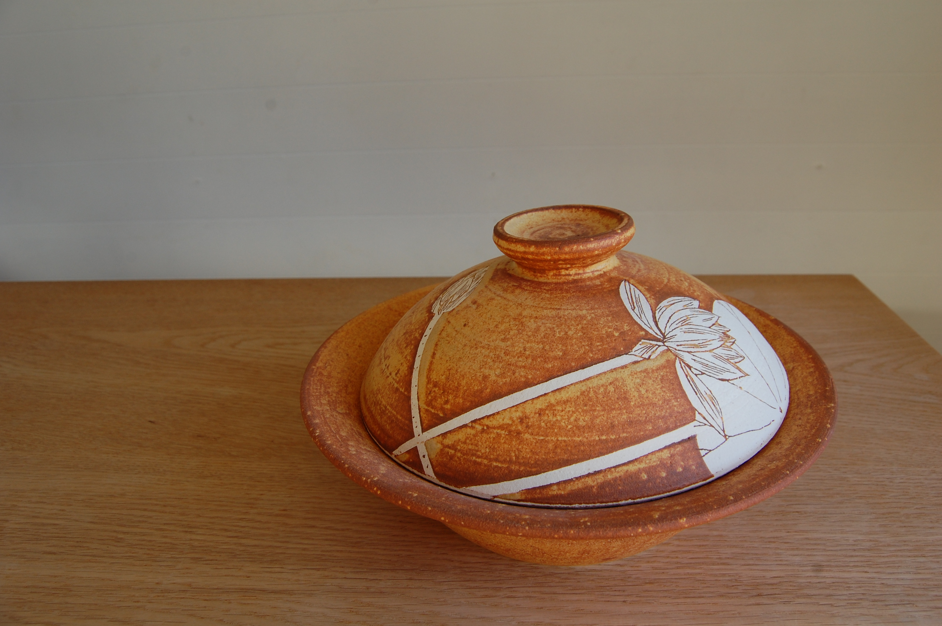 これからの季節に大活躍しそうなこちらの土鍋には、ハスの花と葉とツボミが描かれています。