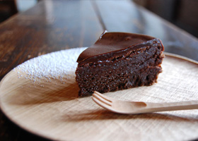 フェアトレード有機クーベルチュールチョコレートをふんだんに使用した、濃厚なガトーショコラ。上掛けしたガナッシュとともに口の中でとろける幸せ。
